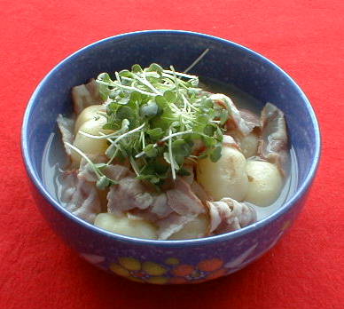 新じゃがは水につけておき、30分ぐらいしたら、手でむけるようになります。それでも皮が残るようであればタオルかたわしでこすればすぐむけます。フライパンに油をひき、新じゃがを炒めます。少し焼き目が付いたら鍋にあけ、水を入れて火にかけます。水は新じゃががおよぐくらい。この時にコンソメスープの素を入れておきます(適量)。そのまま中火で新じゃがの中まで火を通します。ベーコンは適当な大きさに切り、お湯をかけて油抜きし、新じゃがの鍋に入れて少し一緒に煮ます。器にとり、上にかいわれ、浅葱などをかざります。