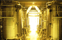 完全無菌状態で約5℃に冷やした麦汁にビール酵母を加えて発酵タンクへ。低温でゆっくりゆっくり発酵させる。酵母が麦汁の糖分をアルコールと炭酸ガスに分解。泡がでてくる。造るビールによって酵母は当然ちがう。直径わずか10ミクロンの酵母も種類がたくさんあって、同じ味のビールを安定して造るため、メーカーは、酵母も優良なものを選び純粋培養して育てている。発酵タンクで1週間発酵すると若ビールができる。まだまだ、若いビール君。味や香りが荒い。もう少し修行=熟成が必要。 さらに1ヶ月から2ヶ月、今度は0℃の低温でゆっくり熟成。若ビールの濁りは静かに沈殿し、炭酸ガスはビールの中に次第にとけ込んでいく。 |