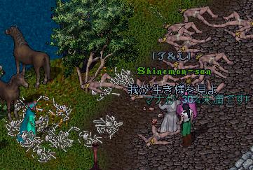 ムーンゲート前の死体をみて。 ライバル心を燃やしまくったしんえもん殿と 記録挑戦してみました。 次回は50体作るとやる気満々のしんえもん殿だったり(笑 |