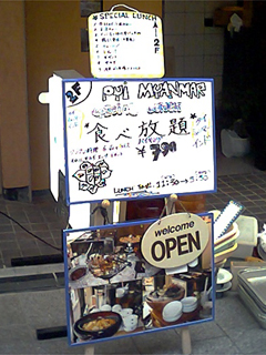 最近できたミャンマー料理及び焼肉のお店。ランチのメインは3〜4種類のカレーだが、チャーハンとか佃煮とか出てきてアジアっぽいのなら何でもありって感じ。最初に行った時はローストチキンとかあって味も美味しかったのに、先日は…。焼肉食べ放題ランチも始めたらしいっす。 |