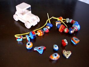 手先の訓練用玩具 紙粘土で形を作り、乾かした後水性ラッカー で着色。ビーズといっても幼児の練習用なの でつかみ易い様、大き目に。紐は、文房具屋 で書類止め紐のカラフルなものを選定。これ だと紐の端が固めてあり通し易い。