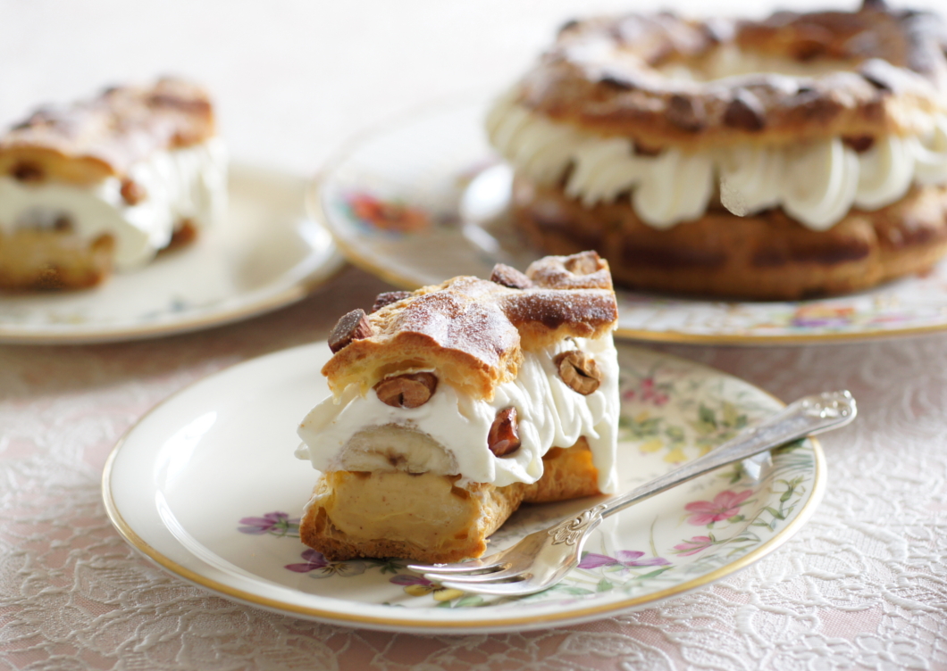 アーモンド風味のカスタードとバナナのソテー、たっぷりのホイップクリームがよく合い、とても美味しいシュー菓子です。アーモンドのキャラメリゼがとても香ばしく、いいアクセントになっています。バナナは脇役で、アーモンドの美味しさを堪能できるお菓子です。