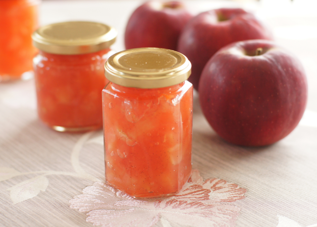 甘酸っぱい林檎のコンフィチュールにバニラビーンズをたっぷり加えて煮た、リッチなジャムです。紅玉の皮を煮出して加えることで、綺麗な色に発色し、香りもプラスしていきます。