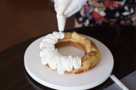 今日は10月最初のレッスンがありました。もう10月に突入、早いですね。今月のメニューはシュー生地を使ったお菓子と、季節の林檎を使ったジャムです。シュー生地のお菓子は色々とありますが、今回はパリ・ブレスト風にリング状に絞って、焼いていきます。クリームがたっぷり、アーモンドとバナナをアクセントに美味しく仕上げていきます。手間はかかりますが、とっても美味しく出来上がります!!