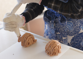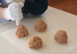 今日は11月最初のレッスンがありました。急に寒さが増してきて、短い秋が駆け足で過ぎていきそうです。今月のメインのメニューはバスクチーズ・モンブランです。バスクチーズケーキにマロンクリームって合うのかな?と思われるかもしれませんが、すごく合ってとっても美味しいです。自分の中ではここ最近の一番のヒットメニューでは?と思っています。栗の味が濃厚で、栗そのそのものの美味しさを存分に味わって頂けると思います(*^-^*)絞るのも楽しいです♪