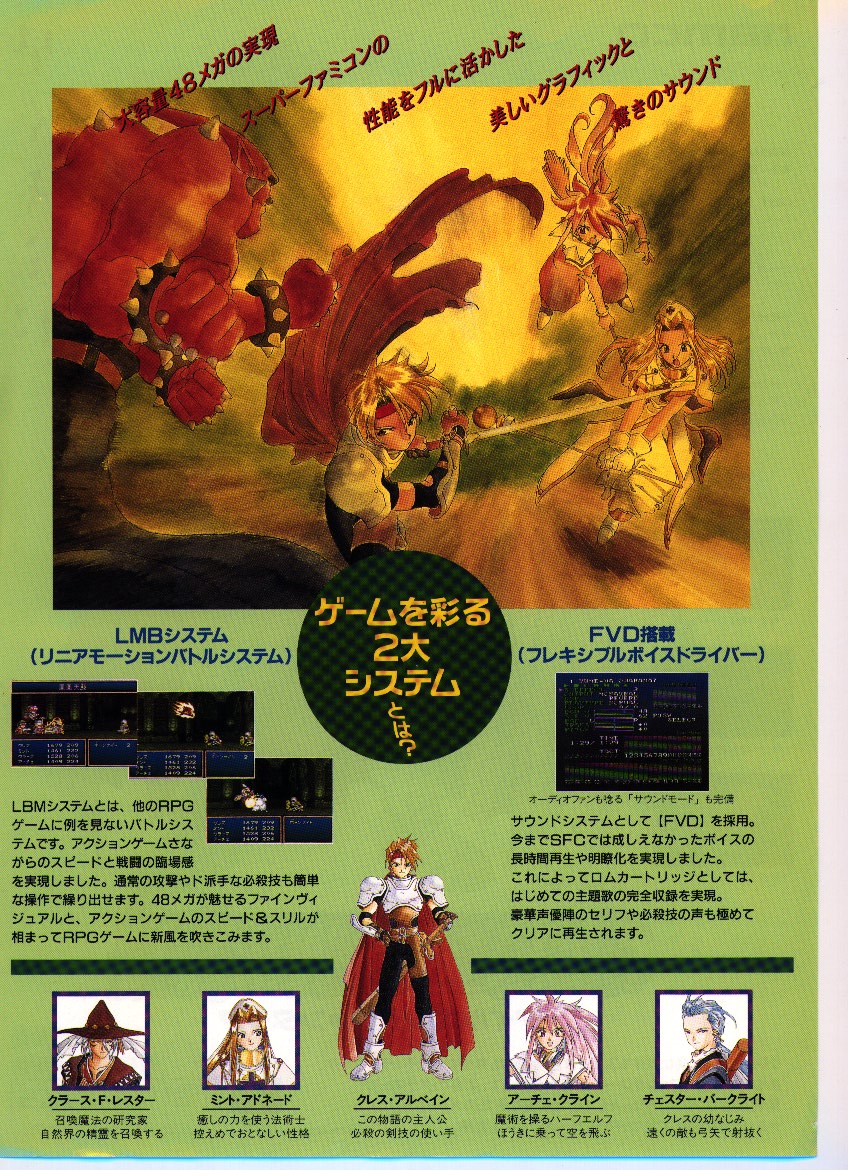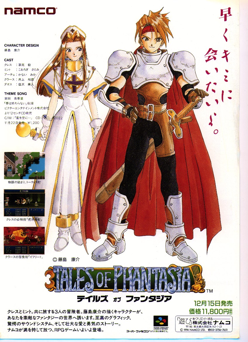 Tales of Phantasia is Role Playing Game for SFC(SNES) produce by NAMCO. First 48MBit-rom cartridge soft,and sing the theme song.