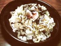 - さやえんどうは、筋をとり、軽く塩茹でし、細切りにする。
