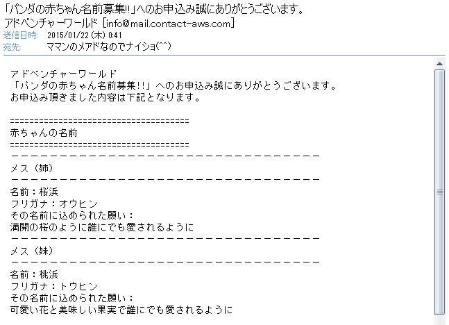 | 2月13日(金) パンダ命名続報 2月6日。 和歌山アドベンチャーワールドで、昨年12月に生まれた、双子のパンダの命名セレモニーが開催されました。 姉妹の名前は、桜浜(オウヒン)と桃浜(トウヒン)。お名前募集でママンが応募したのと同じお名前でした。 新聞で見て、ママンと私は大喜び。 その日の夜はテレビでニュースのはしごをしたり、ネットでもパンダ命名の記事を探したりで、すっかりはしゃいでおりました。 そして昨日。 和歌山アドベンチャーワールドから、封書が届きました。 それがこれ。 ![]() 中を見て、またもや大喜び! ![]() 桜浜、桃浜で応募した人の中から抽選でもらえるという、ジャイアントパンダふたごの赤ちゃん名づけ親証でした。 命名者のママンと他4名様が、アドベンチャーワールドに無料で入場できます。 命名者のママンは、赤ちゃんパンダプレミアムツアーにも参加できます。 キャッホランラン♪ ママンから、早速行こうと誘われました。 ですが我が家には、愛ワンワンののんきクンが。 車で出て、犬づれOKのホテルに泊まるか。 はたまた、5人入れる入場券で、2人しか入らないのももったいないので、私はパスしてちょうど家族が4人いる妹一家に権利を譲るか。 春休みの混む時期は避けたいしで、ただいま思案中です。(^^ゞ |