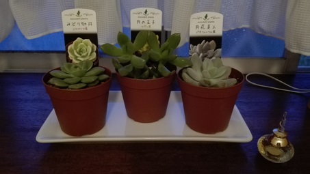 | 11月8日(火) タニク~ラブ(^^) 最近、多肉植物ラブです。 きっかけは特になく、最初は園芸を趣味にしているママンにくっついてホームセンターをうろうろしてたとき、形が面白いな~と見てたくらい。 だけど世間様ではけっこうなブームになってたらしく、ホムセンだけじゃなくてインテリアショップや雑貨屋さんでもお目見えするようになってました。 気になるから、目につくようになったのか。 はたまた、目につくから気になるようになったのか。 ともあれ、気がついたときには、いつの間にか多肉植物を買おうと思っている私が。 最初にゲットしたのは、こちらの4つ。 ![]() 3つあるのは、左から「みどり牡丹」「月の王子」「月花美人」 1つだけのは「ピーチプリデ」という名前。 どれも名前も素敵です(^^) 実はトイレに飾ろうと思って買いました(^^ゞ だけど調べてみると、多肉植物の生育には、水は少なめでも日光はしっかり当てた方がいいのがほとんど。 屋内の照明しかないショップでばかり見ていたので、陽の光はあまり必要ないのだと勘違いしてました(^_^;) 買ったばかりの頃は、夜はトイレに置いて、昼間は日当たりのいい私の部屋に置いておくようにしていたのですが、毎日の移動がだんだん面倒くさくなってきて、今ではすっかりお部屋の住人になってます。 次にゲットしたのがこちら。 ![]() ハオルチアとグリーンネックレス。 ハオルチアの名前は属名で、学名はハオルチア・オブツーサというようです。 このオブツーサ。私が前から欲しかったものでした。 ぷっくりとしたそれぞれの形と、上部の半透明な窓部分に、どうにも心惹かれまして。 しかし、ハオルチアはただいま大人気。盗難事件も起きるくらいで、お店ではなかなか見られませんでした。 そのハオルチア・オブツーサをホムセンで見つけたときには、もう我が目を疑いました!! 10円玉くらいのちっこい子だけど、迷わずゲット!! うひょうひょしながら店内を歩いていたとき見つけたグリーンネックレスも、あまりの可愛さと上がったテンションでいっしょに買ってしまいました。 これらは先日、植え替え完了。 ![]() 先に買った4鉢は少し育ったので、一回り大きな鉢に植え替え。 グリーンネックレスも、100均にあった可愛い鉢に植え替え。 オブツーサはまだちっこくて、どの鉢に入れても鉢の方が大き過ぎになりそうだったので、今はまだ買ったときのままで置いてます。 以前からの、いただきもののや花屋で売れ残ってまとめ売りされてた観葉植物もあるので、仕事部屋が緑に囲まれて嬉しいぞ。 まだまだほど遠いけど、理想のお部屋はジャングルです(^^) その形に惹かれて集めた多肉植物。 みんな形よく大きくな~れ\(^0^)/ |