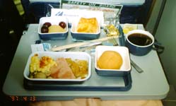 帰りの飛行機はMくんとKちゃんが隣同士、僕とYちゃんと??さんが同じ列にといった感じで座席に座った。僕だけメンバーから離れてしまったのである。朝が早く最初っから寝るつもりでいたのでどうせ隣りでもあまり関係なかったんだけどね。禁煙席が空いてなかったのか、喫煙席になってしまったのでやだなぁと思っていたが、周りみんな朝早い便のためお休みになっていて、タバコの煙は気になるほどではなかった。寝ていたらお食事の時間になった。